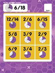 Equivalent Fractions BINGO is a fun educational game for children to practice equivalent fractions. The game has two modes: Easy & Challenge. Easy mode of play displays a pie graphic to represent the fraction. The denominator is represented by the total number of slices and the numerator is represented by the colored slices. Challenge mode displays only the numerical fraction at first. If the student needs help it will introduce a pie graphic representing only the denominator. If they need further help it will display the shaded slices representing the numerator. Challenge points are awarded based on how much help the student needed to correctly answer the question. Less help = more points!