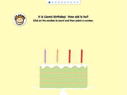Birthday Candle Counting is a fun educational game for kids to practice counting 1-10. Children are asked to count the number of candles to determine how old a child is. All questions are read aloud and verbal feedback is given for all answer choices. After completing ten questions kids are able to decorate a birthday cake!