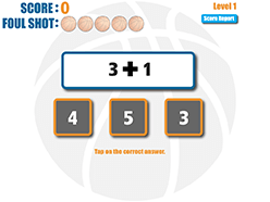 Children will enjoy solving math problems while playing Math Fact Basketball. Children choose from addition, subtraction, multiplication or division practice. Get 5 math problems correct in a row to take foul shots with the basketball. Score reports are available prior to exiting the activity. FOUL SHOTS: To make a foul shot you must press the "ready" button while the moving ball is at the center or intersection of the horizontal and vertical lines.