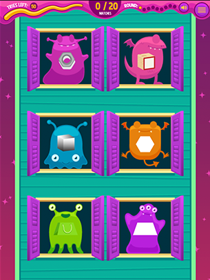 Subscriber? Log in hereMonster Mansion Shape Match is a fun educational game for kids to learn and practice 2D and 3D shapes. Click on the windows of the Monster Mansion to reveal the friendly monsters inside and match objects to shapes or objects to words. Children can play by memory or while seeing the objects. All shapes are supported by audio instruction. Shapes: triangle, sphere, trapezoid, cube, hexagon, crescent, cylinder, cone, heart, rhombus, half circle, circle, oval, octagon, star, pyramid, rectangle, parallelogram, square, and quarter circle.