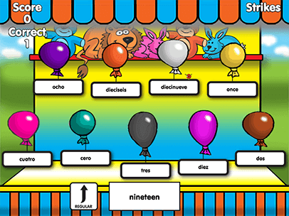 Spanish Word Toss is a fun educational game for kids to practice Spanish vocabulary words. There are over 200 common Spanish words grouped into 11 different categories. Players can select just one category or they can select all of them! They can also choose between Spanish to English or English to Spanish! Get 10 correct matches and choose a new dart toss! Get 3 incorrect in a row and the game is over!