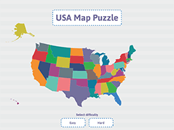 Children practice geography by assembling a puzzle of the USA. This educational activity features two levels of difficulty and keeps a record of your best time to completion.