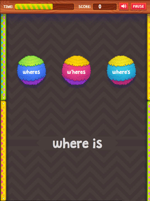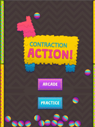 Are you ready to burst into action while practicing contractions?! Join the fiesta in "Arcade" mode by tapping/clicking on the correct contraction spelling and using the slingshot to make the piñata burst open or play "Practice" mode to test your knowledge on contractions and hone your slingshot skills.