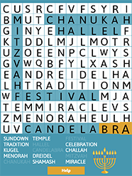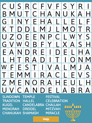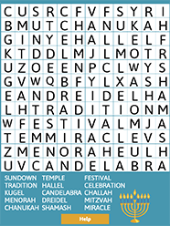 Hanukkah Word Search is a fun holiday activity for children of all ages. Puzzles can be created two ways: a small grid with shorter words or a larger grid with longer words. This feature will allow younger children to enjoy the puzzles too! You can print or play online. Happy Hanukkah!