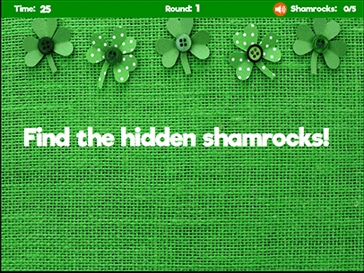Shamrock Hunt is fun holiday activity for kids of all ages. The object of this Saint Patrick's Day activity is to simply find the hidden shamrocks. Look carefully at the pictures and click/tap on the gelt to collect them. These shamrocks are hidden so kids will have to search extra carefully! Good Luck!